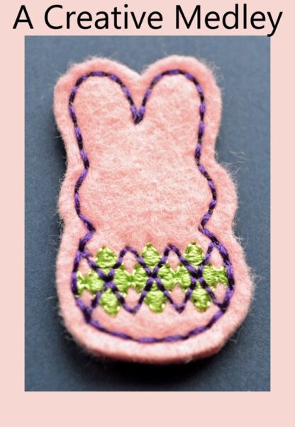 This cute little argyle bunny is stitched entirely in the hoop. It is perfect for hair clippies, bows, zipper pulls, matching games, the possibilities are endless. ITH projects look complicated but are quick and easy. Perfect for Easter or any day.