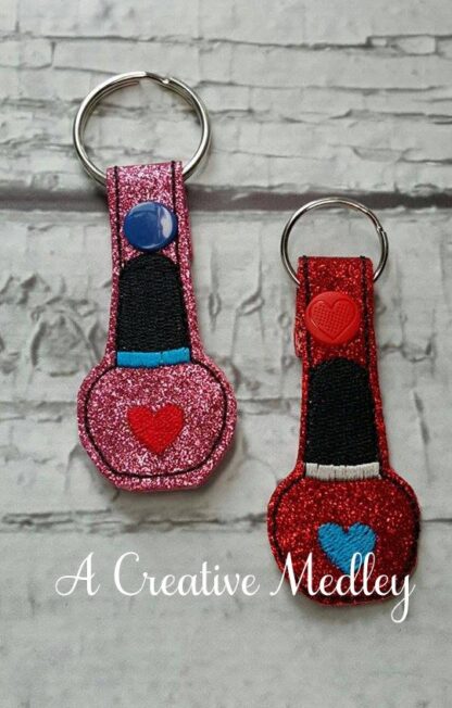 This nailpolish keyfob is stitched entirely in the hoop with no additional sewing required.