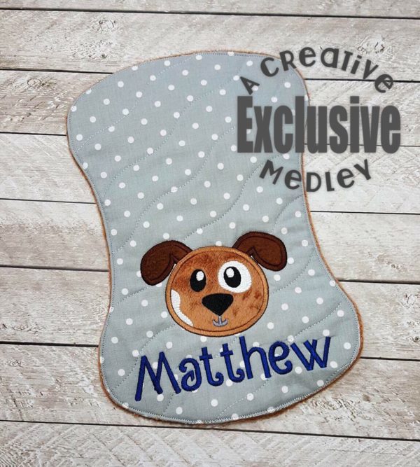 This sweet burp cloth is created entirely in the hoop with just a small hole to sew closed. Includes files with and without a sweet puppy applique.